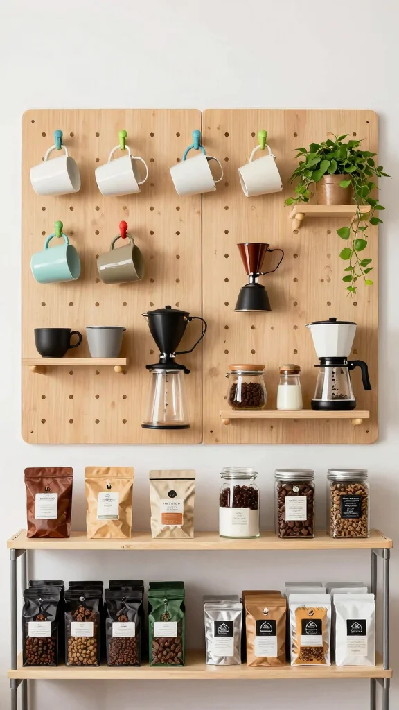 Moreover, you can add shelves or baskets to hold supplies, making everything easily accessible. Here are some engaging ideas for your pegboard coffee station: