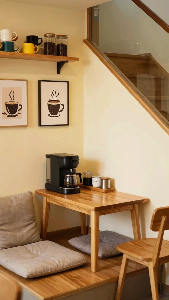 Did you know under-the-stairs corners can add up to 8–10 sq ft of cozy coffee bar station ideas? A compact coffee maker on a small cart and shelves for mugs turn awkward space into a quick, relaxing morning retreat.