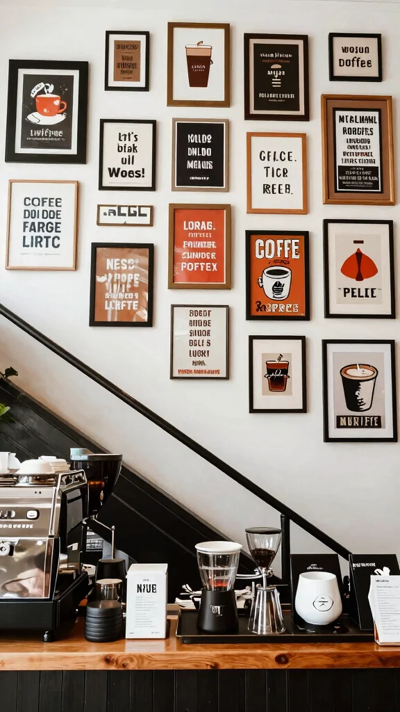 Want to make a statement? Create a stunning gallery wall around your coffee bar area! This stylish approach allows you to showcase your favorite art, photos, or coffee quotes, adding character to your space.
