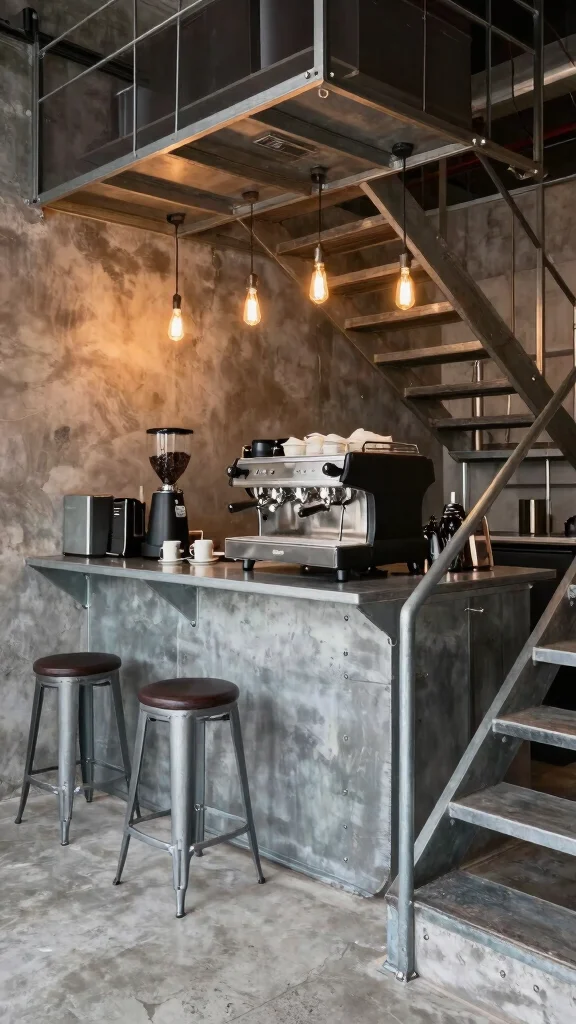 Are you drawn to raw, edgy aesthetics? An industrial-style coffee bar can be a bold choice for your under-stairs area. With metal shelves and concrete surfaces, this design creates a striking look that’s both modern and functional.