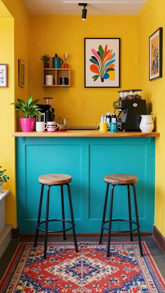 You’ll appreciate how the combination of dark tones and bright accents draws the eye, making your coffee nook a true conversation starter.