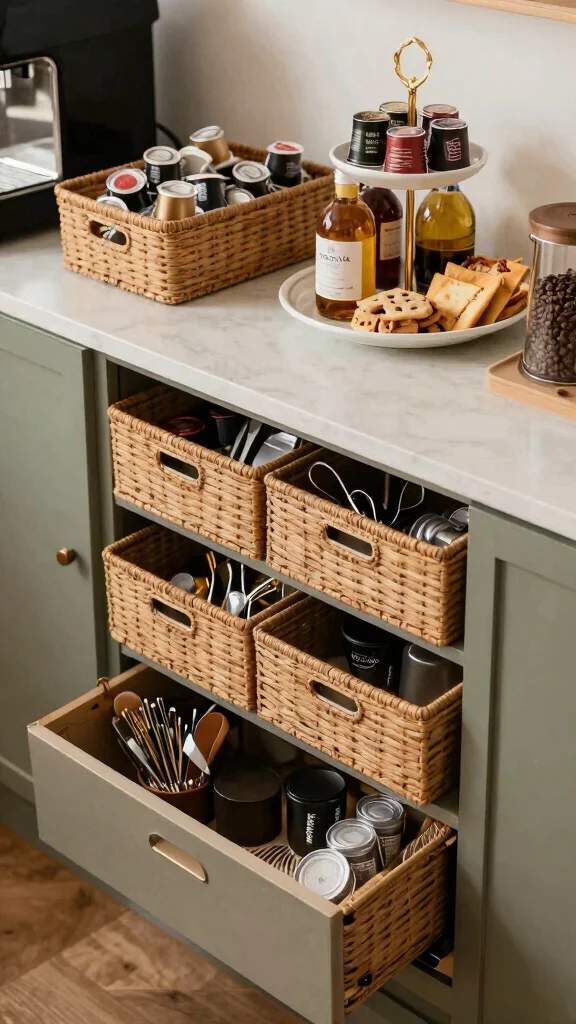 – Use a labeled basket for coffee pods, creating an organized display.