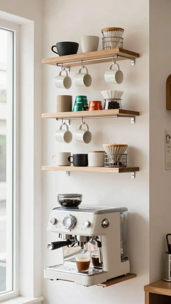 This approach transforms your coffee bar into a stylish and functional area, maximizing every inch without compromising on design.