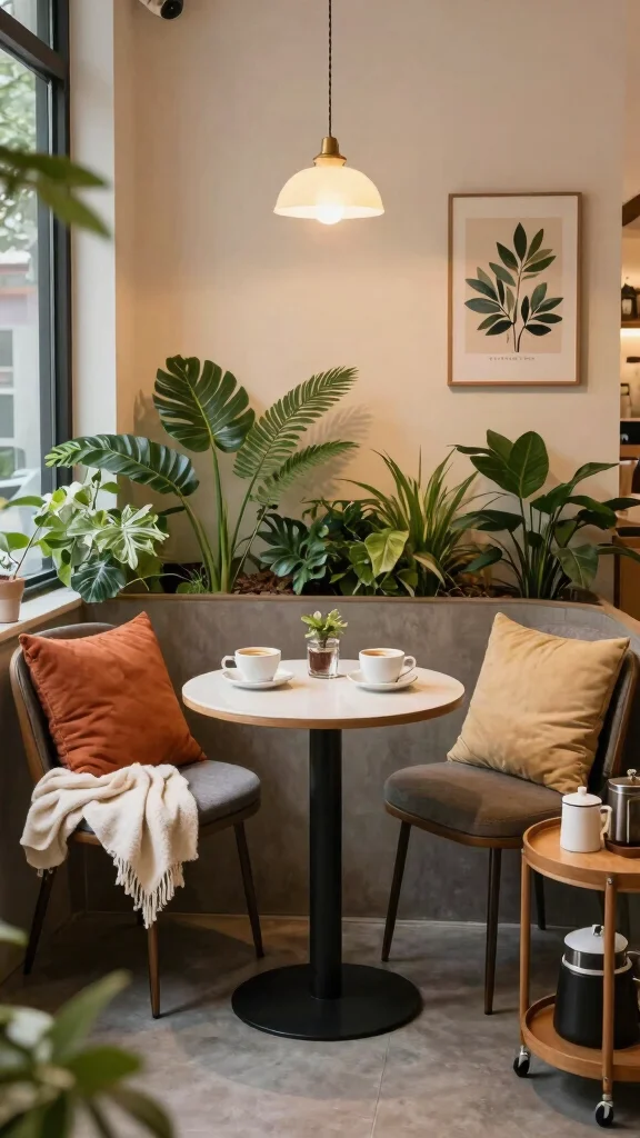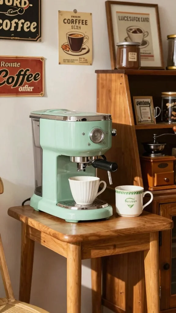 Utilizing retro colors like mint green or soft pink can further amplify this nostalgic feel, making your coffee area a joyful retreat. You can find vintage items at thrift stores or online marketplaces for unique finds.