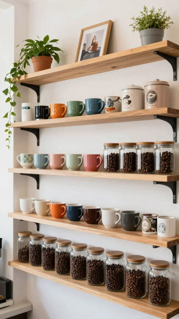 A well-organized open shelf setup transforms your coffee bar into a focal point that reflects your style while enhancing practicality.