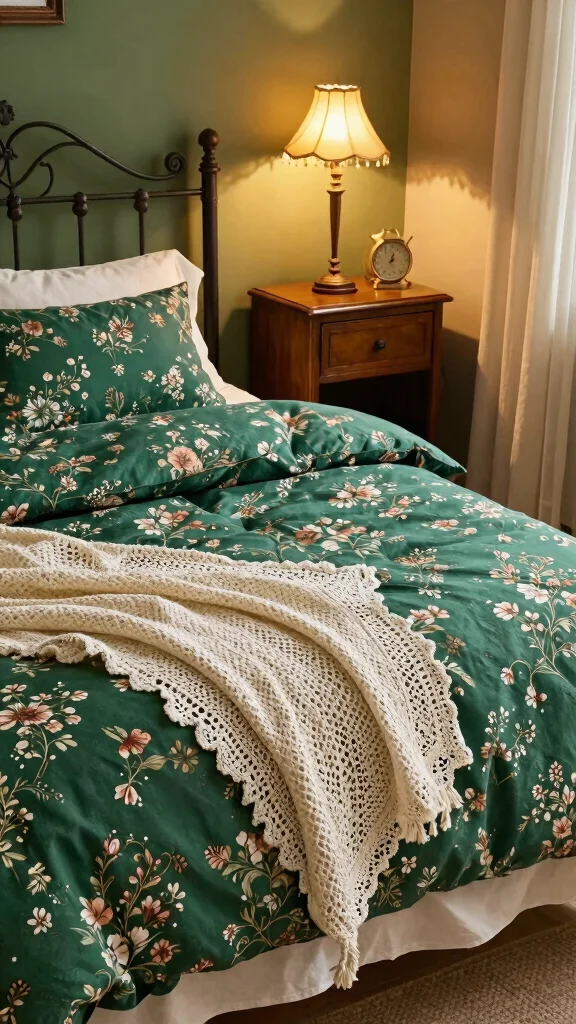 Infusing your bedroom with family heirlooms adds a personal touch and a sense of history. Consider integrating a vintage quilt or textile in deep green hues that has been passed down through generations. This not only adds warmth but also tells a beautiful story behind each piece.