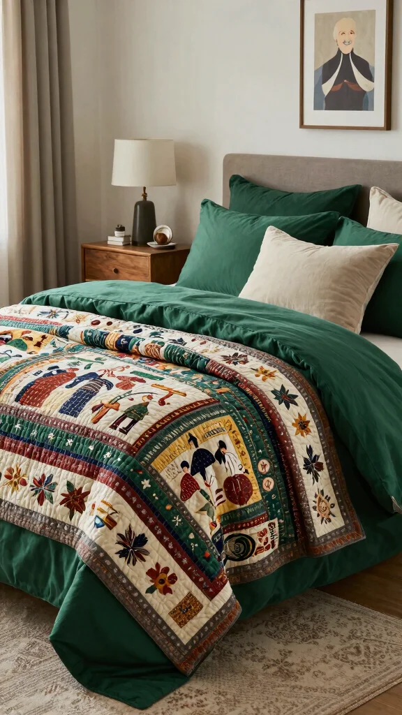 Incorporating these treasured items alongside your deep green bedding creates a cozy, narrative-rich environment. Mix and match with modern decor to highlight the uniqueness of your heirlooms, ensuring they stand out against the rich green backdrop without feeling out of place.