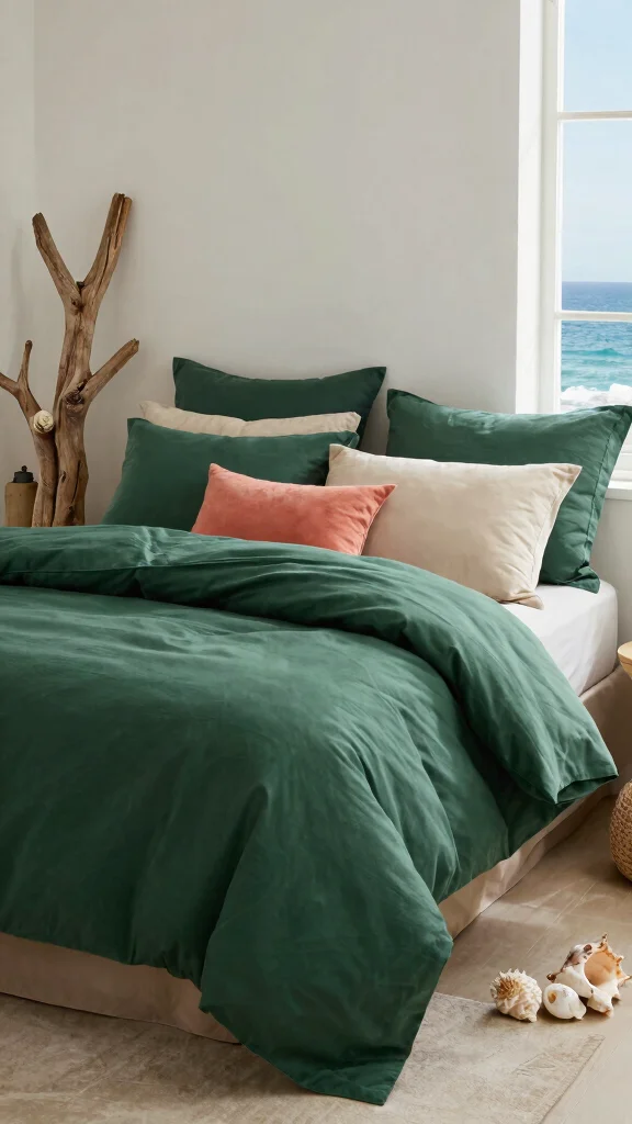 Combine your deep green bedding with light, airy colors like sandy beige or soft coral for a striking contrast. Adding elements such as driftwood decor or seashell accents can beautifully tie the coastal theme together. This blend creates a relaxing space that invites you to unwind after a day at the beach.