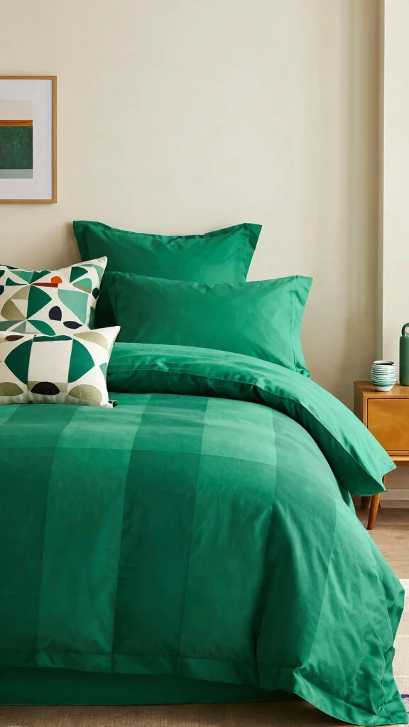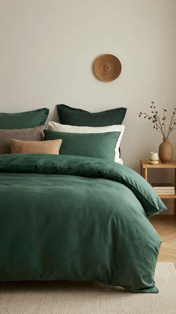 Deep green bedding shines when paired with warm neutrals like cream, beige, and soft gray to keep the space cozy rather than loud.