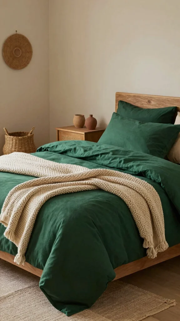 Start with a base of dark green duvet covers or emerald green sheets and layer with textured throws in cream, taupe, or camel.