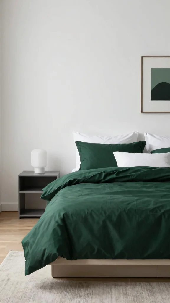 A minimalist bedroom thrives on simplicity, and dark green bedding can serve as a striking focal point. By emphasizing clean lines and a less-is-more approach, you can create a serene space that feels calm and uncluttered. Opt for a dark green duvet paired with crisp white or beige sheets for a relaxing contrast that captures attention.