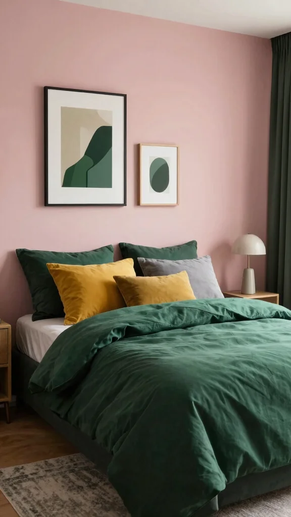 Accent pillows or throws in these complementary colors can serve as eye-catching additions without overpowering the deep green backdrop. Additionally, wall art or decorative pieces that align with this palette can create a well-rounded look, enhancing the cozy and inviting feel of your bedroom.