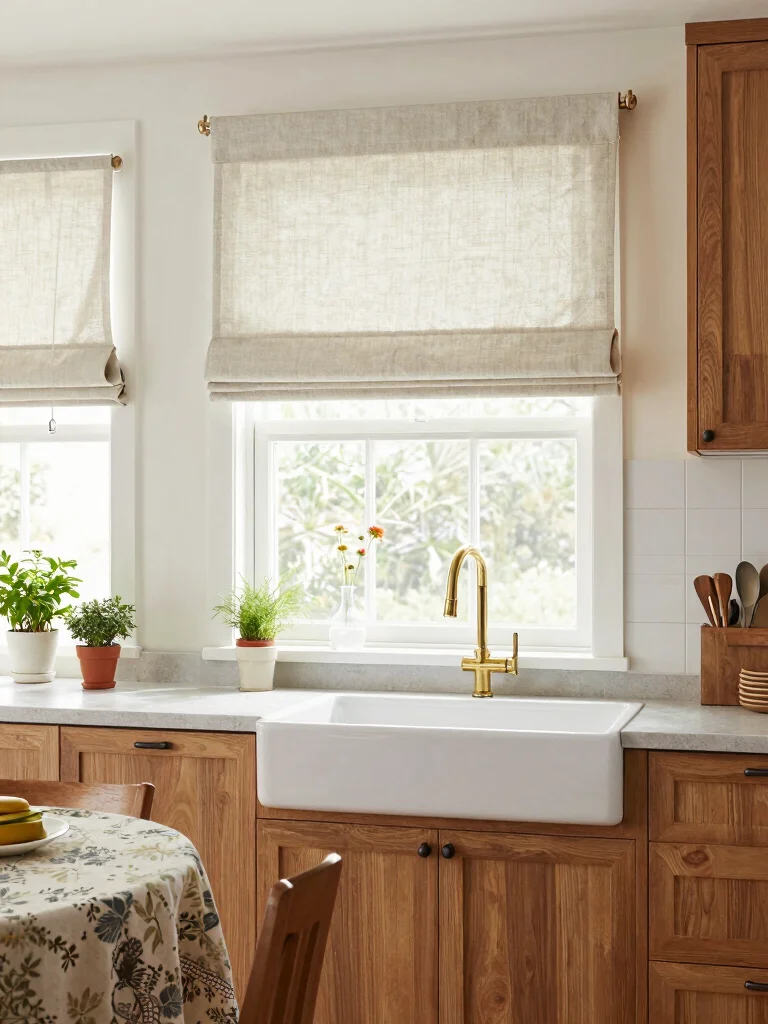 Ideal for kitchens that require functionality and style, Roman shades can be paired with wooden hardware for an authentic touch.