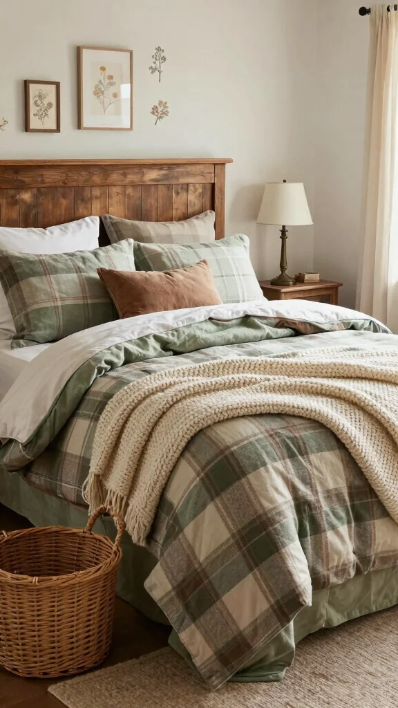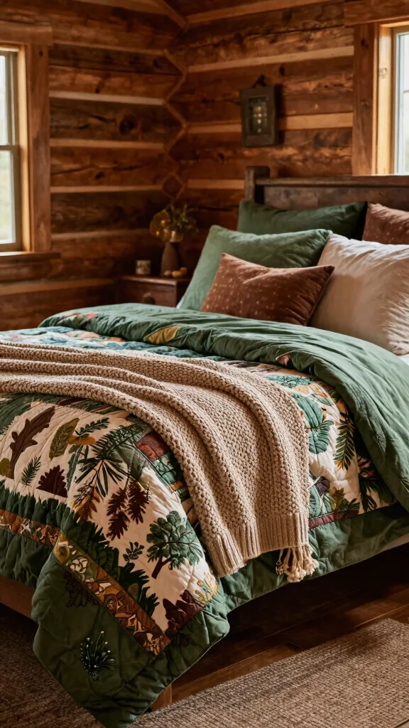 Transform your bedroom into a cozy cabin escape with green and brown bedding that radiates warmth and comfort. Look for quilts or comforters featuring designs inspired by nature, like trees or wildlife, to add a rustic touch. Mixing plaid patterns with solid colors enhances the cabin vibe, creating an inviting and homey feel that wraps you in comfort.