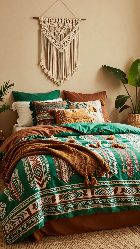 Capture a free-spirited essence in your bedroom with bohemian green and brown bedding that feels eclectic and vibrant. Look for bedding adorned with bold patterns, tribal prints, or nature motifs that reflect your artistic side. Layer colorful throws and mix textures to create a cozy, lived-in atmosphere that invites comfort.