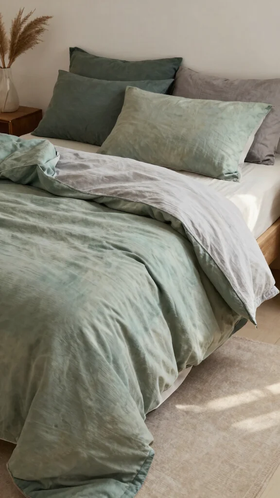 Minimalist green and grey bedding lets a room breathe—start with a soft grey duvet, then layer a sage green throw for calm, understated color. Build depth with texture rather than more pieces.
