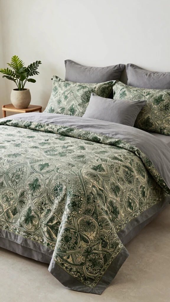 When selecting these patterns, strive for a balanced color mix to keep the space feeling cohesive. Look for duvet covers or quilt sets that showcase a harmonious blend of tones, beautifully tying together your green and grey theme.