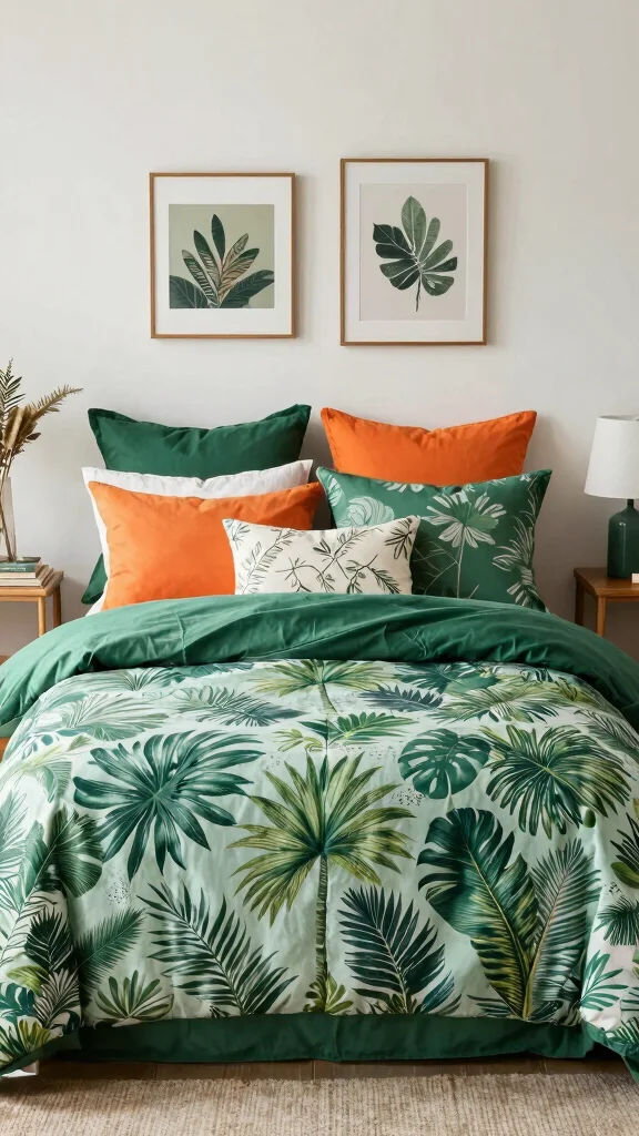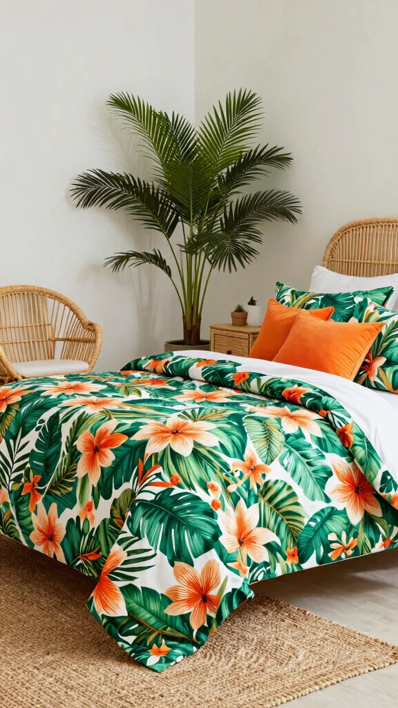 Transform your bedroom into a tropical retreat with vibrant green and orange bedding showcasing lively floral patterns. This combination brings the essence of nature indoors, creating a cheerful atmosphere reminiscent of a sun-soaked getaway. Think of large, colorful blossoms paired with leafy prints for a look that energizes the space while maintaining visual harmony. Incorporating natural materials like rattan furniture and soft cream curtains can balance the bold colors and enhance the overall aesthetic.
