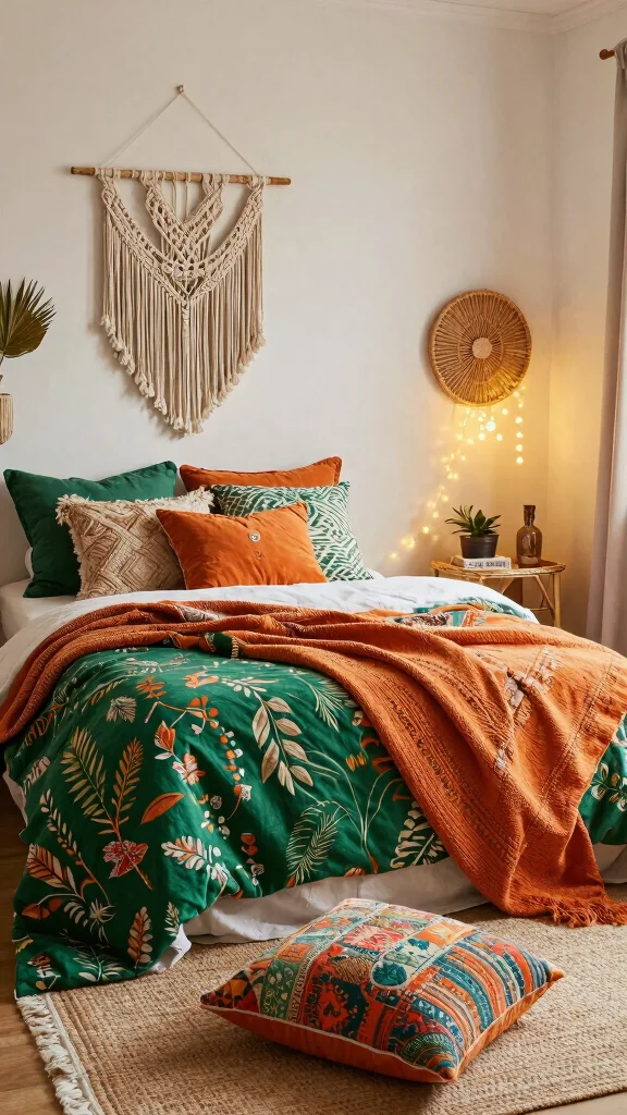 Embrace the free spirit of bohemian style with green and orange bedding featuring vibrant patterns and textures. Mixing bold prints with layered throws and textured pillows creates a relaxed and inviting vibe. This eclectic approach allows for personal expression, making your bedroom a unique reflection of your tastes. Incorporating boho decor such as macramé wall hangings and rattan furniture can complete the look beautifully.