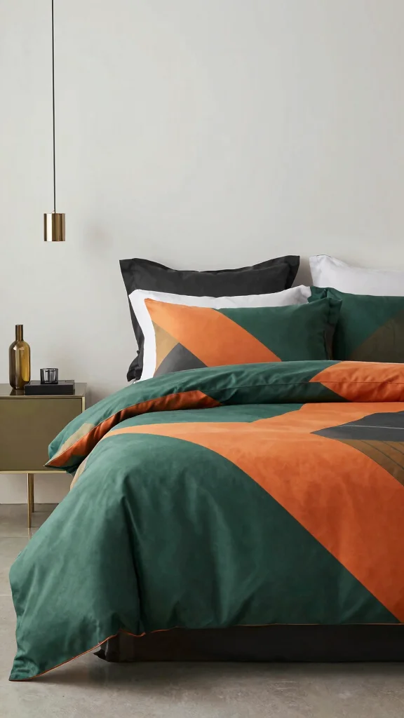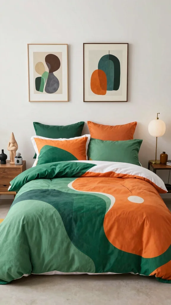 For a contemporary twist, select modern geometric or abstract patterns in green and orange for your bedding. These edgy designs can bring a sophisticated yet playful feel to your bedroom, creating a stylish sanctuary. Pairing this bedding with minimalistic furniture and sleek decor elements enhances the modern vibe. Incorporating metallic accents like gold or silver can add a touch of glamour.