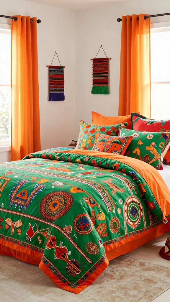 Celebrate the joy of color with bedding that features festive prints and patterns in vibrant green and orange. This lively theme can infuse your space with energy and excitement, making it a joyful retreat. Combining diverse cultural influences in your bedding and decor, such as ikat or tribal prints, creates a unique and vibrant look. Accessories like colorful wall hangings and bright cushions can reflect the festive atmosphere beautifully.