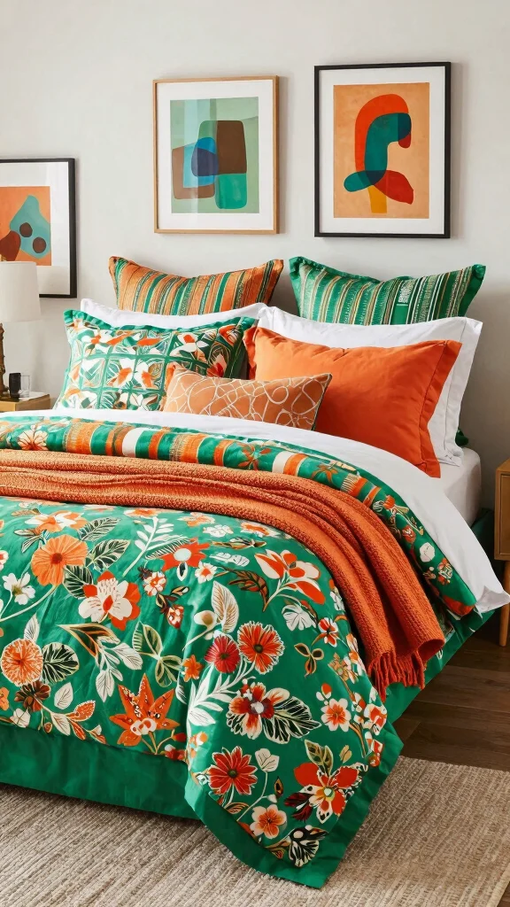 Great question. Start with a palette anchor (green + orange + a neutral) to ensure harmony. Mix patterns with different scales—pair a large striped print with a smaller floral or geometric motif. Limit yourself to 2–3 patterns to avoid visual clutter, and balance them with solid pieces in greens or oranges. Introduce texture with cotton, linen, velvet, or jute throws to add tactile interest. When in doubt, choose prints that share a common color and opt for eco-friendly bedding options to keep things sustainable.
