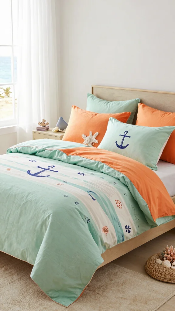 Bring a touch of the beach into your bedroom with coastal-themed bedding in calming green and vibrant orange. Opt for nautical prints or soft, wavy patterns that evoke the feeling of the seaside. Pair this bedding with light, airy furniture and decor elements like coral or seashell accents to enhance the coastal vibe. Adding sheer curtains can allow natural light to filter in, creating a breezy atmosphere.