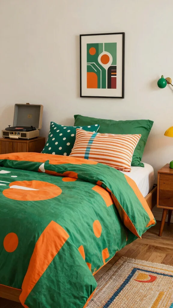 Dive into nostalgia with bedding that features bold green and orange patterns inspired by retro design. Geometric shapes or playful polka dots can instantly add a quirky charm to your bedroom, evoking the vibrant spirit of the 70s. This style pairs effortlessly with vintage decor, such as an old record player or funky art pieces. The key is to embrace mismatched patterns that complement each other, creating a fun and inviting atmosphere.