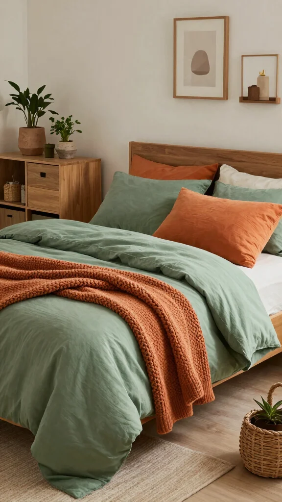 Fun fact: Green and orange bedding paired with natural fabrics instantly signals calm, and homes with natural fiber bedding report up to 30% more restful sleep. Add wooden furniture and plants to complete the earthy elegance.