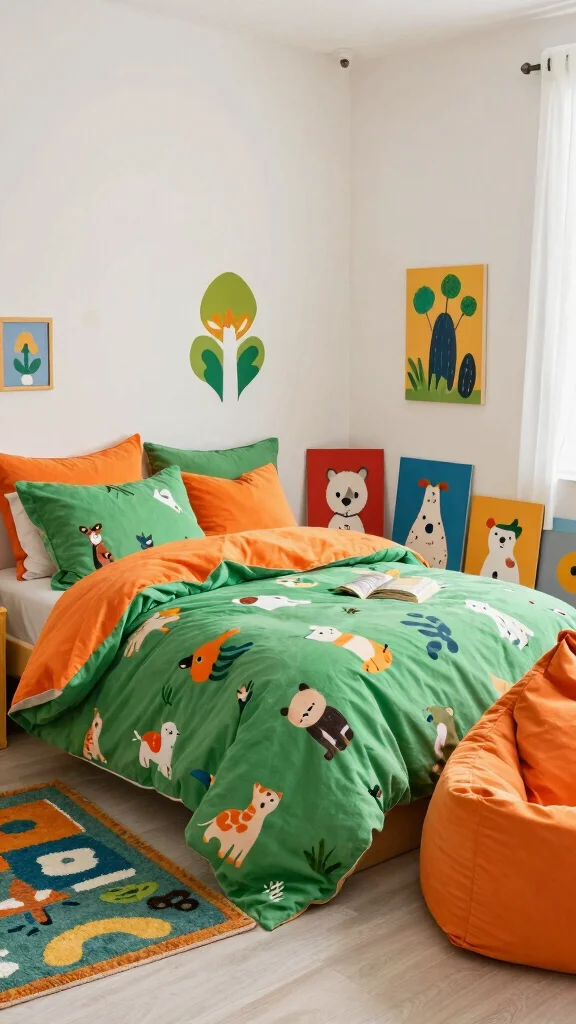 Embrace playfulness with bedding that features whimsical patterns in vibrant green and orange. Think delightful motifs like cute animals or butterflies that inspire joy and creativity. This cheerful style is perfect for children’s rooms or any space where a lighthearted atmosphere is desired. Accessorizing with colorful rugs and fun wall decals can amplify the charm of your whimsical wonderland.
