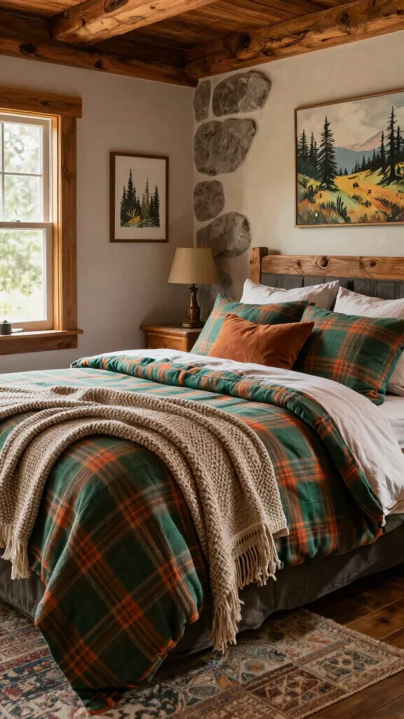 Bring the charm of a rustic cabin into your home with green and orange bedding featuring cozy plaid or check patterns. This design evokes warmth and comfort, creating a welcoming environment that feels like a retreat. Pair your bedding with natural wood finishes and earthy tones to enhance the rustic feel of your space. Adding knitted throws or textured blankets can elevate the coziness of your bedroom.