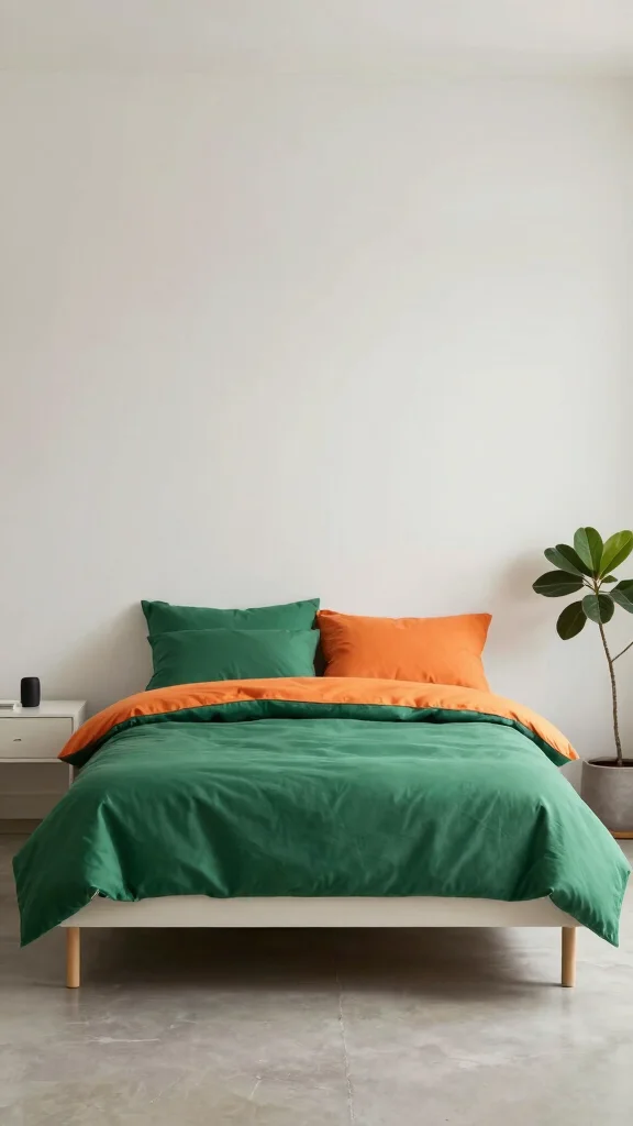 Add vibrancy to your bedroom by mixing green and orange bedding with contrasting colors. Incorporate cushions and throws in shades like turquoise, yellow, or deep purple to create an energetic display. This lively approach adds depth and character, offering a fresh perspective on color schemes. Pairing contrasting colors can uplift your mood and energize your space, making it a perfect retreat for recharging.