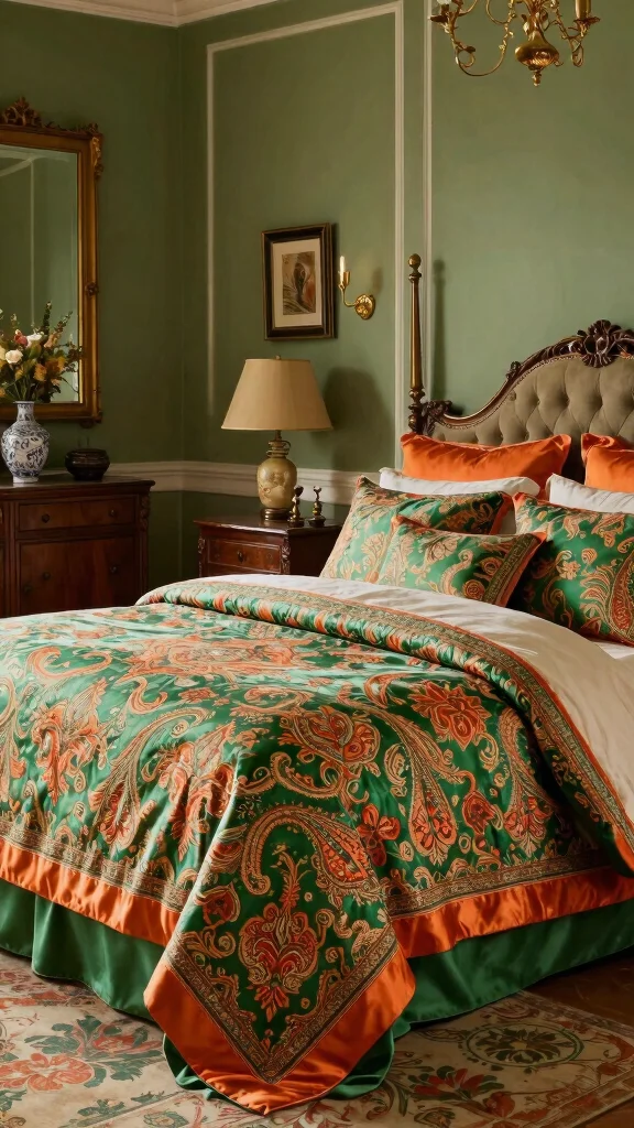 Introduce a traditional touch to your bedroom with bedding that features intricate green and orange patterns. Think elegant paisley, damask, or classic floral designs that elevate your space’s sophistication. This style pairs beautifully with antique furniture and vintage accents, creating an atmosphere of timeless elegance. Using rich fabrics like silk or velvet can further enhance the luxurious feel.