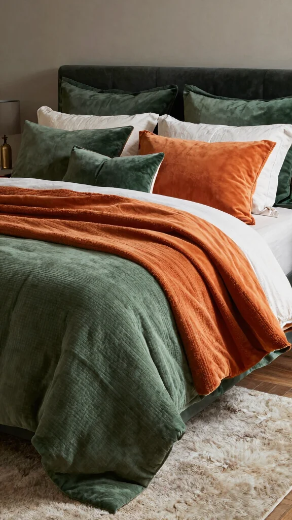 Create an indulgent atmosphere with layered bedding that features rich green and orange tones. Use a variety of textiles such as soft quilts, plush blankets, and cozy throws to add dimension and warmth to your space. Mixing textures like velvet, linen, and cotton can elevate the overall look of your bedroom, making it a perfect spot for relaxation.