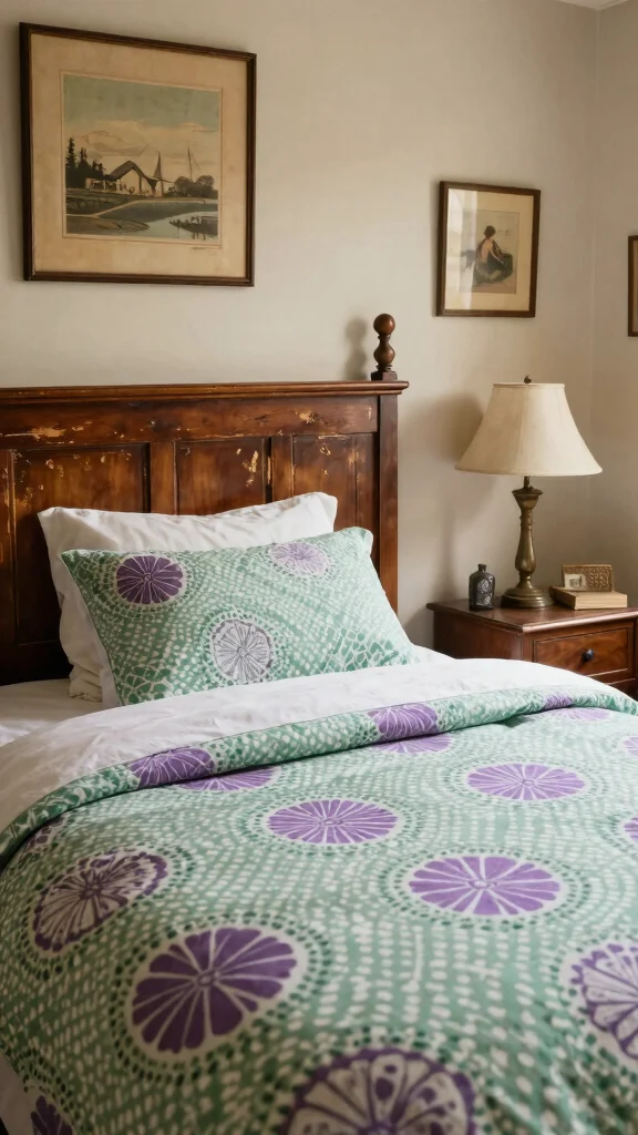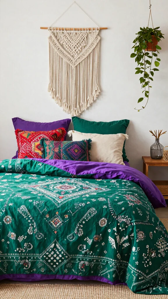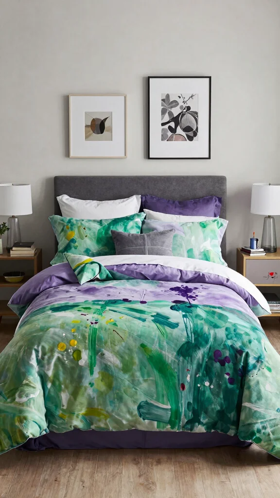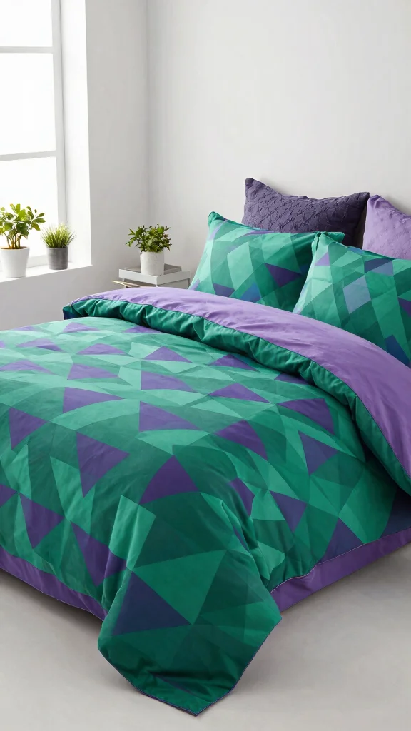 Fun fact: Geometric bedding with triangles or hexagons can make a room feel 10-15% more energetic. Pair bold green and purple bedding with solid sheets for a polished look; this balance keeps the space calm while staying vibrant.