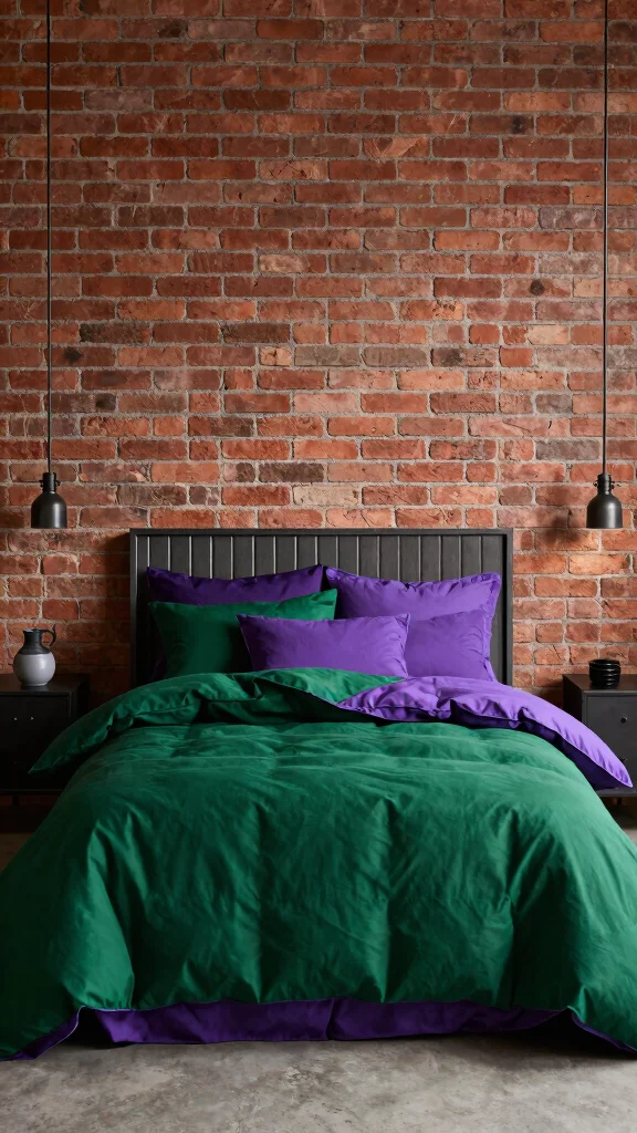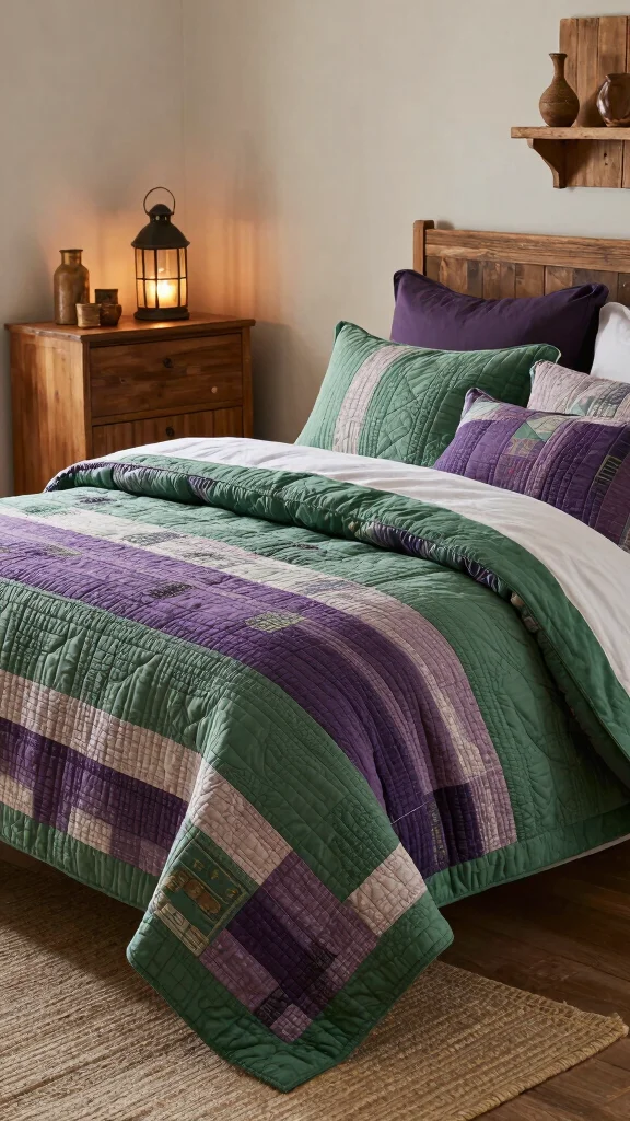 Create an inviting atmosphere by layering different textures in your green and purple bedding. Start with a soft cotton base, then add a plush velvet or faux fur throw, finishing with an assortment of textured pillows. This layering approach brings warmth and visual interest, making your bed the ultimate cozy retreat.