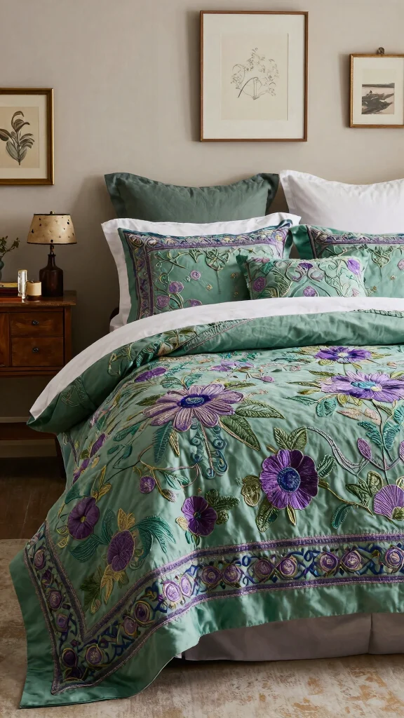 Infuse your bedroom with craftsmanship through crewel-embroidered bedding that features green and purple designs. This traditional technique results in unique patterns and textures, transforming your space into something truly special. Opt for floral or geometric designs to maintain a modern twist on classic styles.