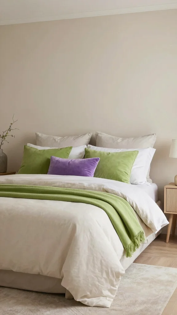 Start with soft neutral bedding as your base and accent it with vibrant pops of green and purple. This design approach creates a fresh, inviting look that feels both stylish and adaptable. Choose light beige or off-white bedding, then introduce lively green and purple throws, along with pillows featuring interesting textures or patterns.