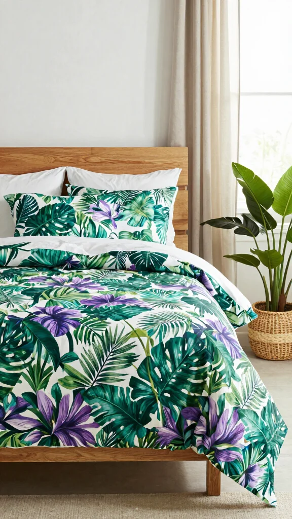 Bring a sense of paradise to your bedroom with tropical-inspired bedding featuring palm leaves and vibrant floral designs in greens and purples. This trend injects a lively and fun element, transporting you to a blissful escape. Pair this bedding with light, airy curtains and natural wood accents to amplify the tropical ambiance.