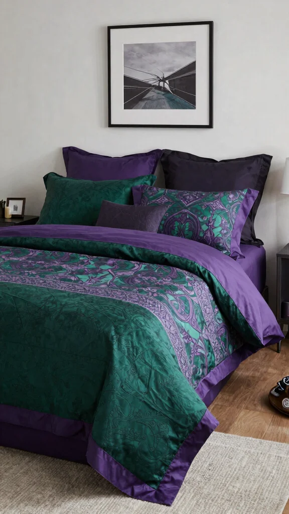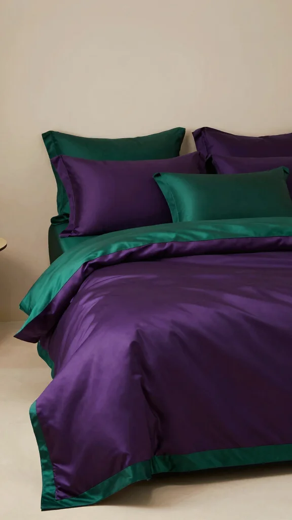 For an ultra-luxurious touch, choose silk bedding in rich green and purple hues. Silk not only looks stunning but also feels incredibly soft and indulgent against your skin. A deep purple silk duvet paired with emerald green silk sheets transforms your bedroom into a lavish retreat.