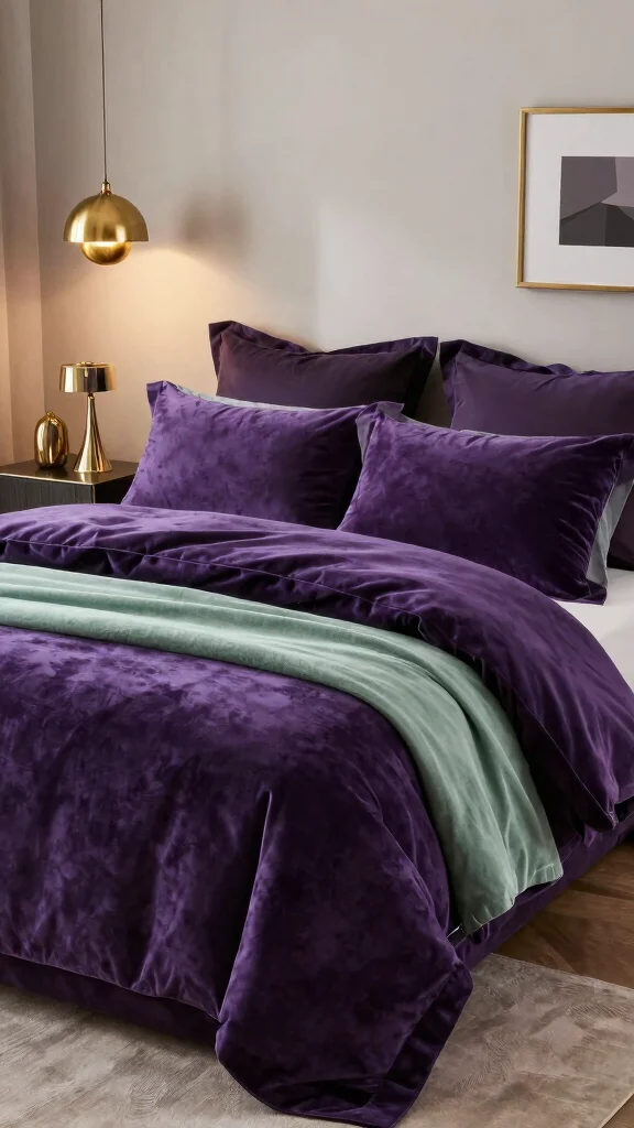 Transform your bedroom into a luxurious escape with sumptuous velvet bedding in deep shades of purple. The rich texture of velvet adds an element of sophistication that feels indulgent against your skin. Opt for a plush velvet duvet and coordinating pillows, complemented by a lighter green throw at the end of the bed to create a harmonious balance of colors.