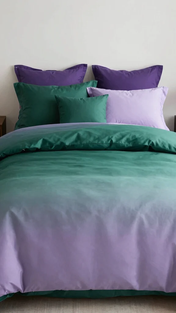 The ombre effect in green and purple creates a stunning visual gradient that captures the eye. Imagine a duvet that seamlessly transitions from a deep emerald at the top to a soft lavender at the bottom. This design adds a unique depth to your bedding and overall bedroom decor, creating a soothing ambiance that invites relaxation.