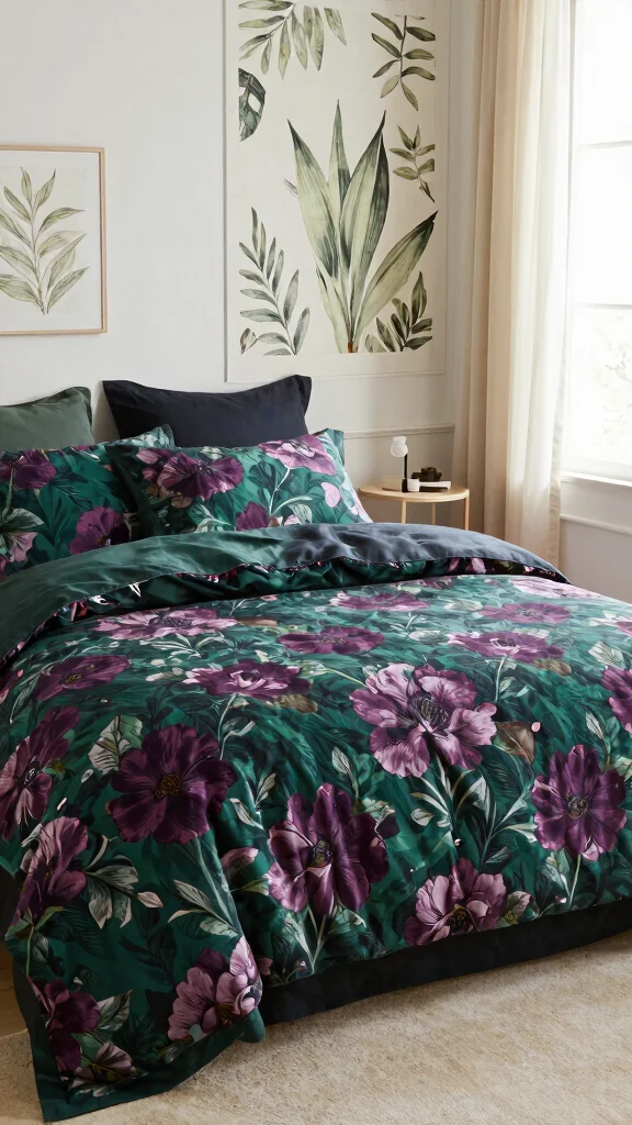 Infuse your bedroom with romance through floral patterns in rich greens and deep purples. Imagine a soft cotton duvet adorned with large, vibrant blooms that invigorate the space. These designs add a feminine touch while creating an inviting and stylish atmosphere, perfect for chic home decor.