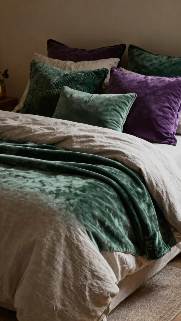 Incorporate velvet bedding for a touch of luxury and softness that enhances your room’s elegance.