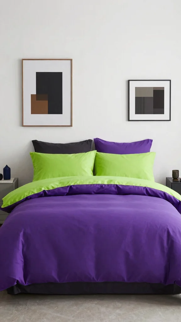 Color blocking on the bed makes a room feel instantly modern. A rich purple duvet with vibrant green accents creates bold contrast, while minimal decor keeps the look chic. It’s practical too—swap in new pillows for a fresh season.