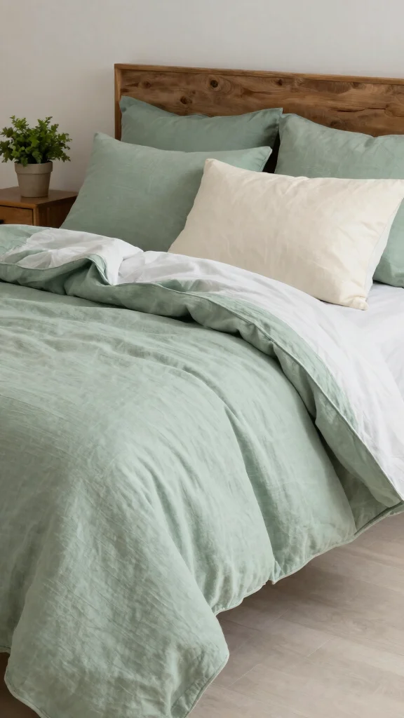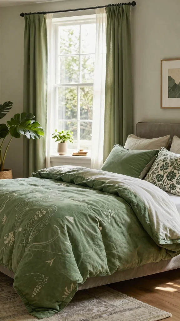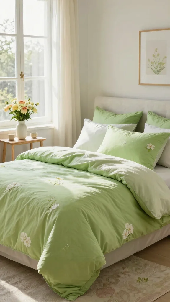Updating your bedding with seasonal green hues can align your bedroom with the changing beauty of nature throughout the year. Lighter greens evoke the freshness of spring, while deeper shades create a cozy feel in fall and winter.