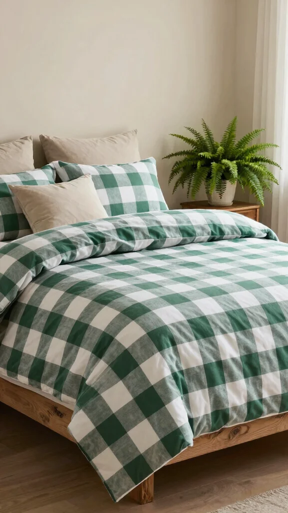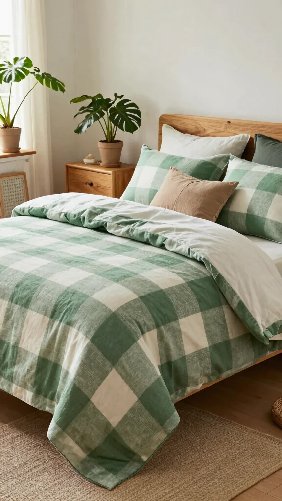 Introduce green checkered bedding as the hero, then add a few green home decor accents—plants, a woven throw, and natural wood furniture.