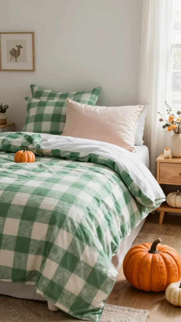 Green checkered bedding serves as a beautiful foundation for all your seasonal decor needs, making it a smart investment!
