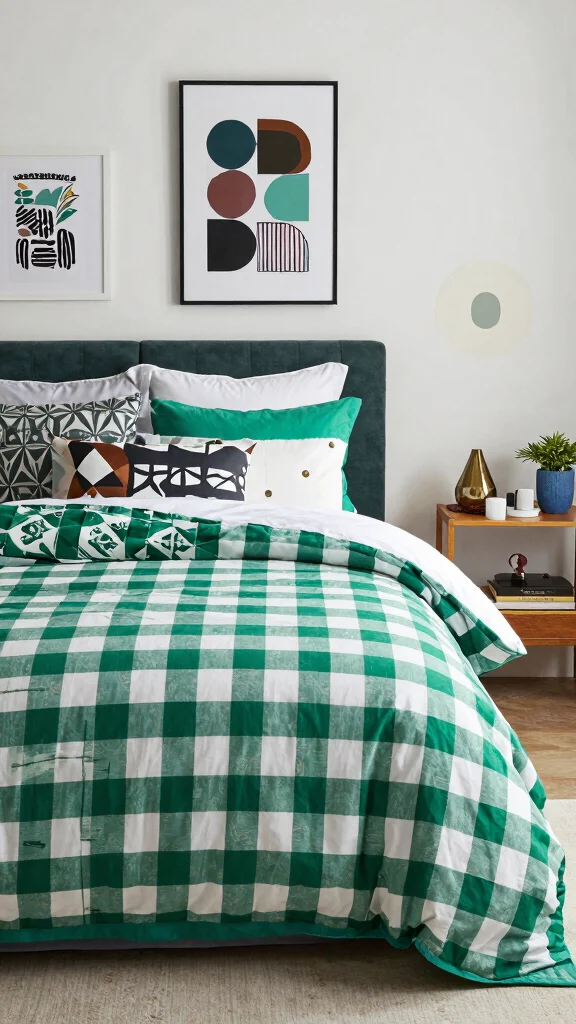 14. Artistic Flair with Custom Green Checkered Bedding