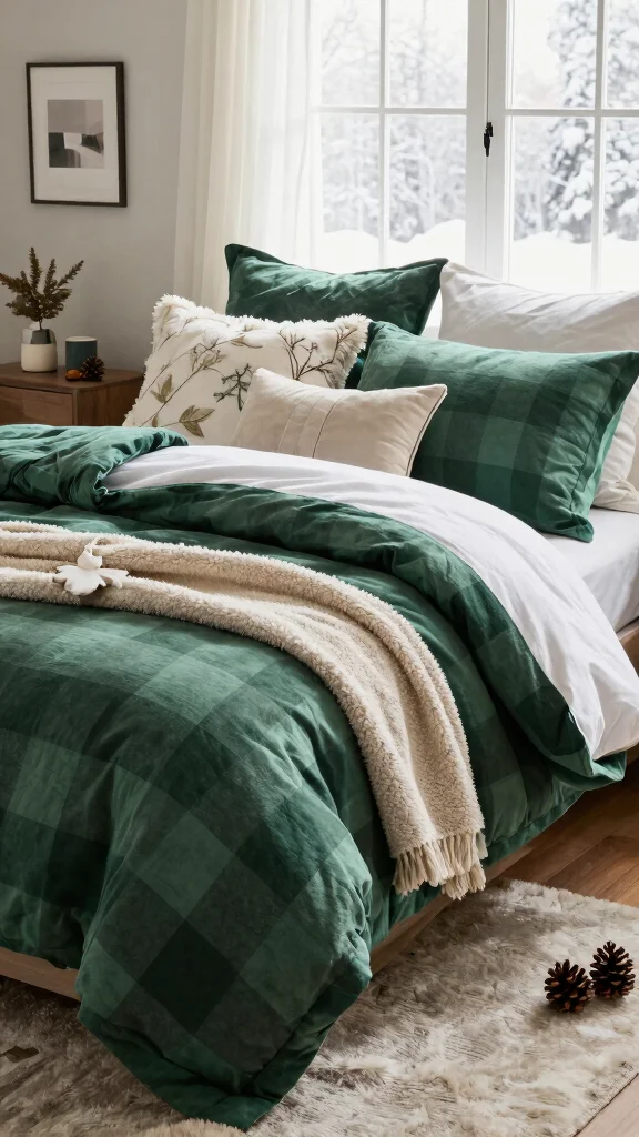 16. Seasonal Swap: Green Checkered Bedding for Winter Comfort